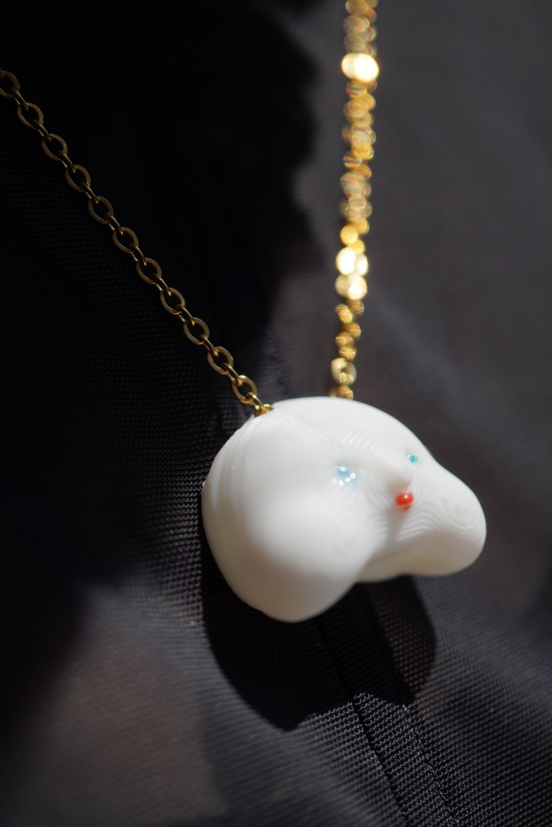3Dプリンターで精密に造形された小さな“顔”をモチーフにした、軽やかなネックレス。